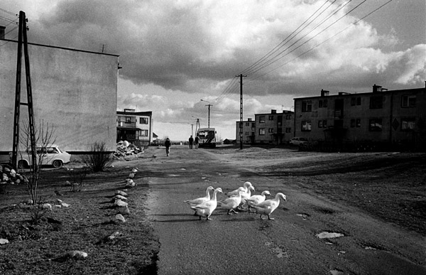 Pegeerowskie bloki błyskają błękitem telewizorów.